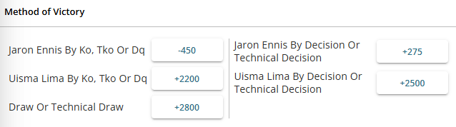 Here are the odds for the Jaron ‘Boots’ Ennis vs Uisma Lima IBO super welterweight title fight from BetOnline.ag (odds taken October 10th).