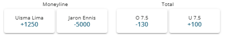 Jaron Ennis is a huge -5000 favorite according to the betting odds. Based on the odds Ennis has an implied probability of 98% to win the fight. Lima is a +1250 underdog, which implies a probability of 7.4% Lima pulls off the upset. The extra 5.4% is the juice in the betting market.