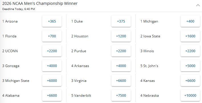 Here are the odds for the 2026 NCAA Tournament winner from BetOnline.ag (taken on March 17th):