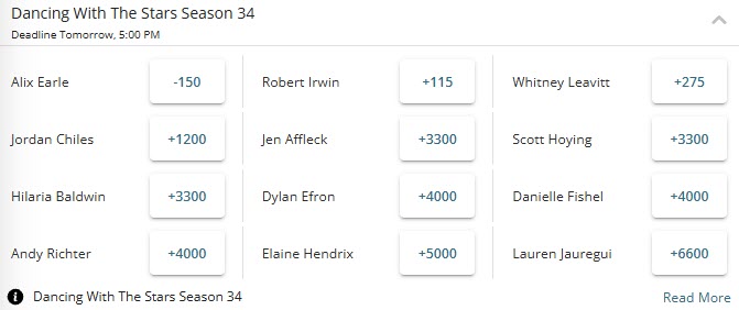 Here are the odds for the Dancing with the Stars season 34 winner from BetOnline.ag (odds taken on September 29th):