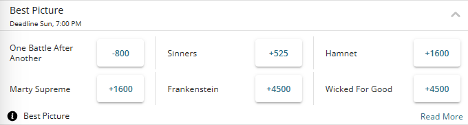 One Battle After Another is a significant favorite to the coveted Best Picture category. According to the odds Sinners is the only other real threat to win.