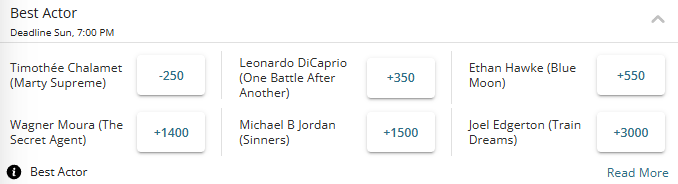 Timothee Chalamet is the favorite for his performance in Marty Supreme, while Leonardo DiCaprio and Ethan Hawke are the other two top contenders.