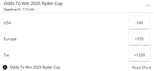 You can also select ‘Props’ followed by any of the Ryder Cup props categories to see the different Ryder Cup betting markets available entering the event. Some of the event props include point totals (over/unders) for individual players, top overall point scorer, top American point scorer, top European point scorer, event correct score, and more.