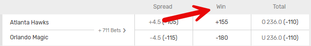 In the Magic vs Hawks example the Magic are -180 favorites to win the game. This means you would have to bet $180 to win $100 (payout of $280) wagering on the Magic to win. The Hawks are +155 underdogs so a $100 bet would win $155 (payout of $255) if they pulled off the upset. Check out our American odds page to learn how to the odds work.
