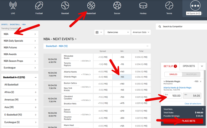 Here’s a screenshot showing the clicks to find the NBA betting lines and place a wager. I’m using a bet on the Magic from the above example in the screenshot below:
