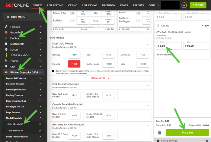 Once on the BetOnline website, select ‘Sports’ from the top menu bar and then navigate to the Winter Olympic sport that you want to bet on. BetOnline has a ‘Winter Olympics 2026’ category which has most of the Winter Olympic sports. The Olympics hockey tournament odds can still be found under the ‘Hockey’ drop down menu.